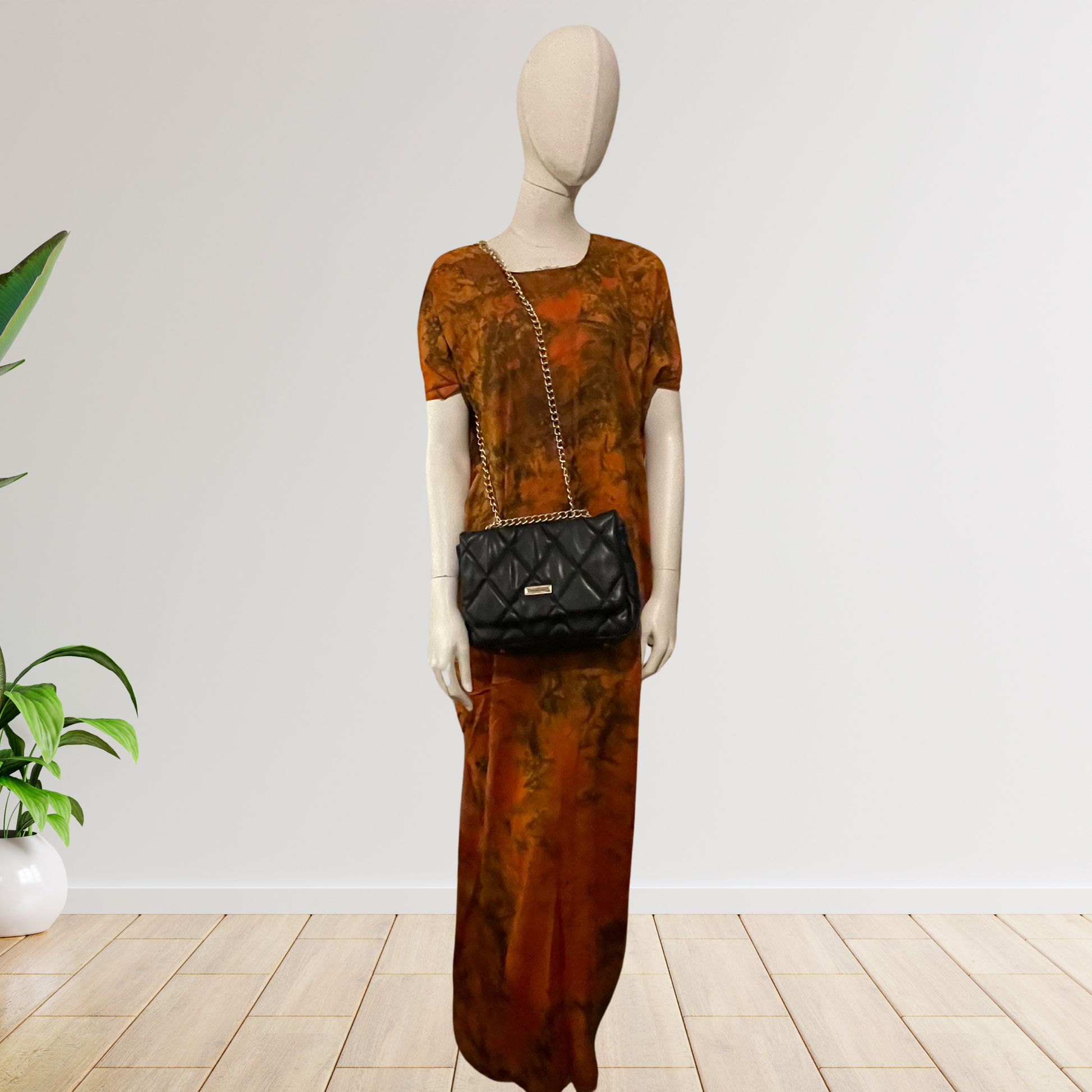 Dirac Karis är en traditionell somalisk baati, en lång och löst sittande klänning som ger både komfort och elegans. Den har korta ärmar, en rundad hals och är tillverkad av lätt, flödande tyg ? perfekt för varmare klimat. Klänningen på bilden har en batikinspirerad design med naturliga och konstnärliga mönster. Dirac Karis är ett populärt val för både vardag och avslappnade sociala tillfällen.